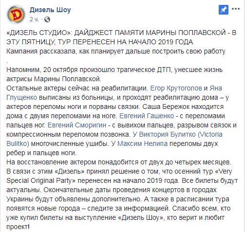 Организаторы "Дизель студио" перенесли свой осенний тур "Very Special Original Party" на начало 2019 года из-за трагической гибели в ДТП ведущей артистки Марины Поплавской 20 октября. Об этом компания сообщила на своей странице в Facebook.