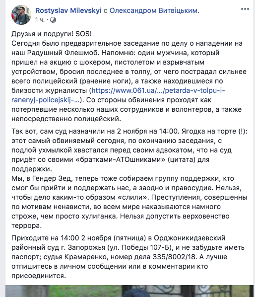 Мы, в Гендер Зед теперь тоже собираем группу поддержки, кто смог бы прийти и поддержать нас, а заодно и правосудие. Нельзя, чтобы дело каким-то образом «слили». Преступления, совершенные по мотивам ненависти, во всем мире наказываются намного строже, чем просто хулиганка. Нельзя допустить верховенство террора».
