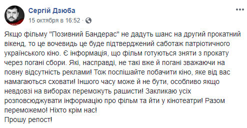 "Если фильму "Позывной Бандерас" не дадут шанс на второй прокатный уикенд, то это очевидно будет подтверждением саботажа патриотического украинского кино. Есть информация, что фильм готовятся снять с проката из-за плохих сборов, которые на самом деле не так уж плохи ввиду полного отсутствия рекламы! Поэтому спешите увидеть кино, которое от вас пытаются скрыть! Другого времени может и не быть, особенно если вскоре на выборах победят рашисты!" - сказано в сообщении.