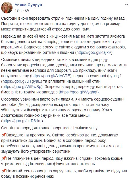 Перевод часов на зимнее время может вызвать дополнительный стресс для организма. Об этом исполняющая обязанности министра здравоохранения Ульяна Супрун написала на странице Facebook.