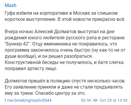 "Вчера ночью Алексей Долматов выступал на дне рождения юного любителя русского рэпа в ресторане "Бункер-42". Отцу именинника не понравилось, что программа закончилось очень быстро, и он решил разобраться", - сказано в сообщении.