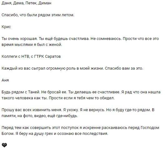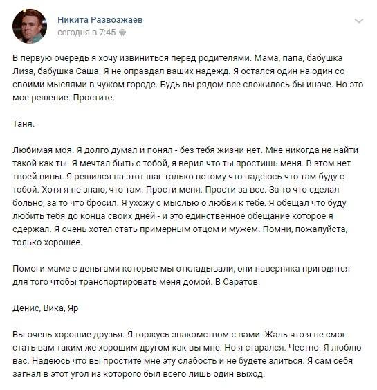 Прощальную записку Развозжаев оставил на своей странице в соцсети ВКонтакте. В письме он извинился перед родителями, бывшей женой, друзьями и коллегами.