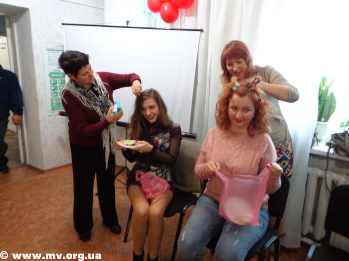Затем герои побывали в роли парикмахеров: с помощью заколок и резинок для волос они сотворили прически под названием "Сказочная поляна", "Сюрприз", "Последний день недели". Шедевры на голове творили на скорость, а вот разбирали их медленно, приговаривая: "Да тут ножницы надо!" Море улыбок вызвал конкурс на лучшую доярку. "Коровкам" привязали "вымя" - медицинские перчатки, наполненной водой, а затем "подоили". За победу в конкурсах они получали призы, которые пригодятся в работе - салфетки, губки для мытья посуды.