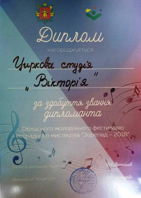 По результатам финала фестиваля определены победители конкурса в каждой номинации. Среди победителей и цирковая студия «Виктория». Теперь ее воспитанницы примут участие в гала-концерте, который состоится 9 ноября в ДК «Днепроспецсталь» (г. Запорожье).