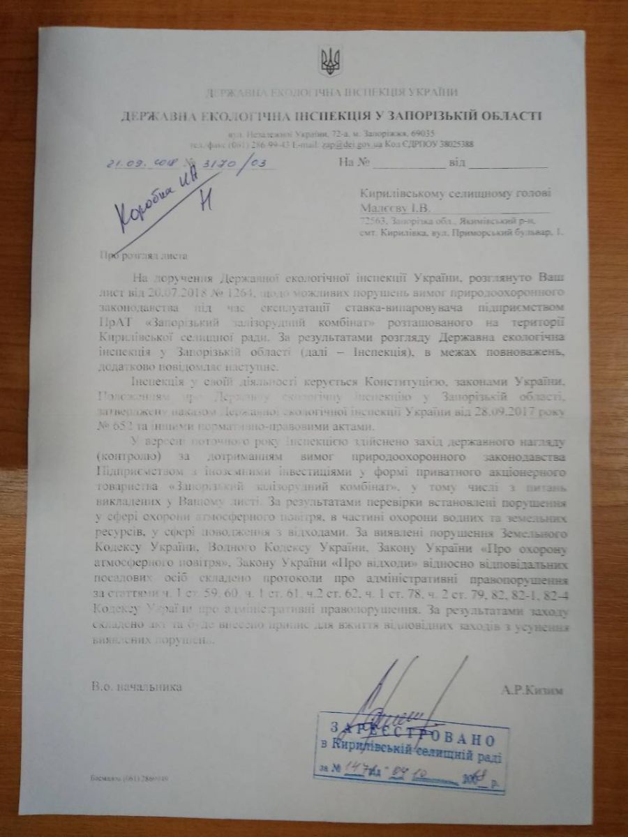 Руководство ОТГ обратилось в Департамент экологии и природных ресурсов Запорожской областной государственной администрации с просьбой предоставить оценку действиям железорудного комбината и принять соответствующие меры относительно его администрации.