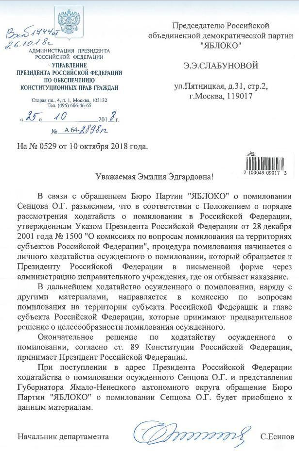 «Право помилования — исключительная прерогатива президента, Конституция России не ограничивает президента в этом праве. Призываем не бояться осуществить этот шаг, важнейший с гуманитарной, правовой и политической точек зрения», — говорится в обращении, которое направили Путину еще 28 сентября. В это время Сенцов еще держал голодовку.