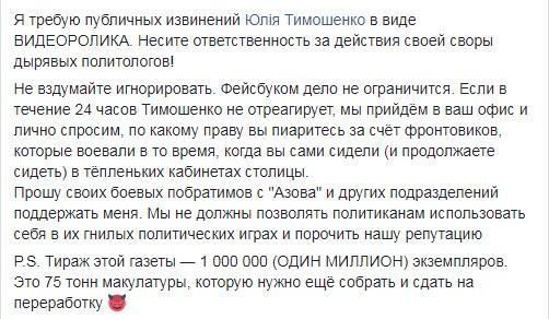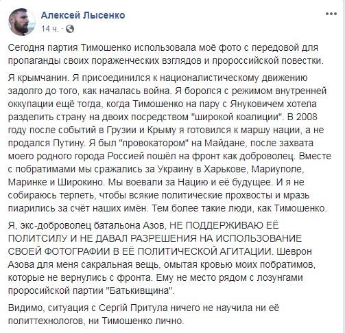 По мнению воина, военные, которые полегли на Донбассе, не могут служить для пиара в политике, а шеврону Азова не место рядом с пророссийской партией. Если на протяжении суток Тимошенко не ответит, то бойцы пообещали прийти в партийный офис и спросить, кто давал им право рекламироваться за счет воинов АТО, которые были на фронте в то время, когда политики отсиживались в комфортных кабинетах. Пост Лысенко собрал тысячи перепостов, комментариев и позитивных откликов.