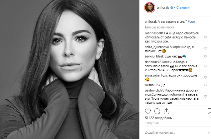 Активно гастролирующая в России и от этого впавшая в немилость в Украине певица Ани Лорак показала в соцсети новый образ. На странице в Instagram она опубликовала черно-белое фото. "А вы верите в сны?", - подписала Ани Лорак свой снимок.