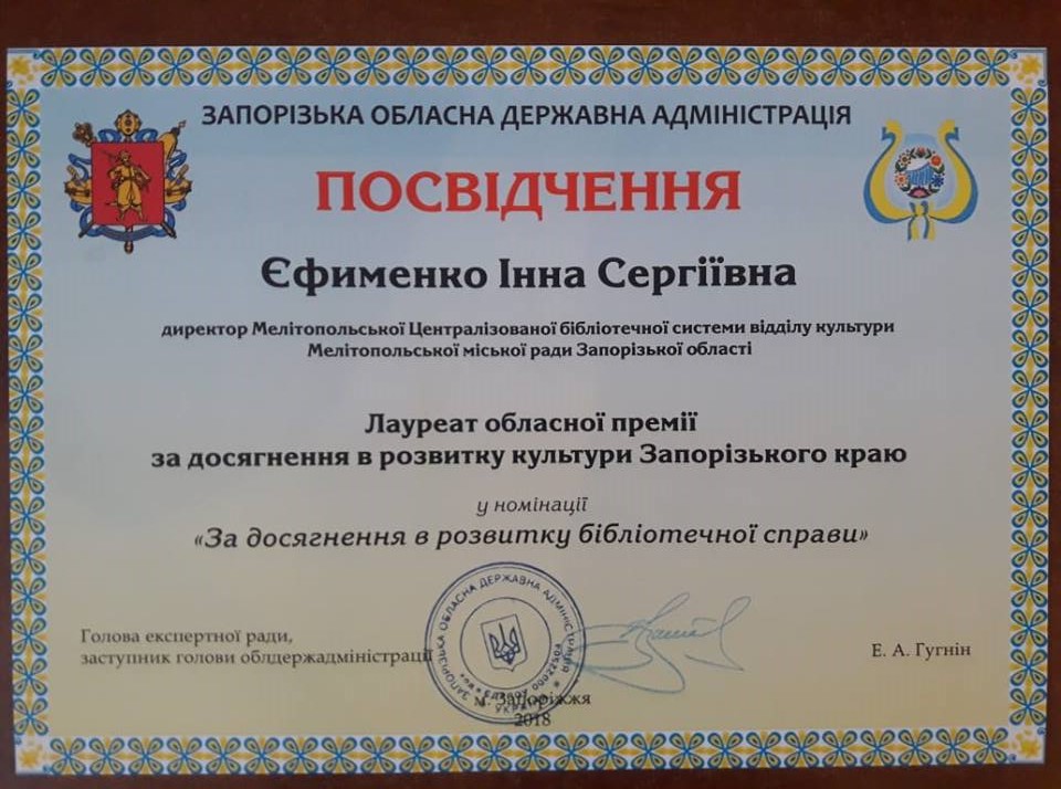 Удостоились премии директор Мелитопольской централизованной библиотечной системы (ЦБС) Инна Ефименко и преподаватель художественной школы Сергей Михно.