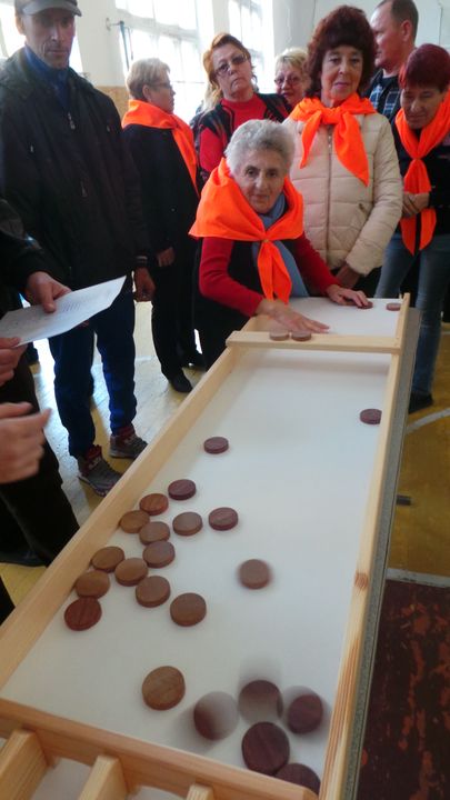 Вокруг стола, где состязались в эластике, слышались взрывы смеха. Игра эта новая и легкая: по краям игрового поля натянута эластичная резинка, натянешь ее – и шайба полетела с одного поля на другое. Игру карум называют «бильярд на пальцах»: прежде чем погнать фишку в лузу, участники сосредоточенно думали. Больше всего азартных болельщиков было вокруг стола с джакколо, наверное, если бы спартакиада длилась неделю, шайбы гонялись бы с таким же увлечением! Организаторы приготовили чай с бубликами, но спортсмены просто не могли оторваться от своих мячиков и дротиков.