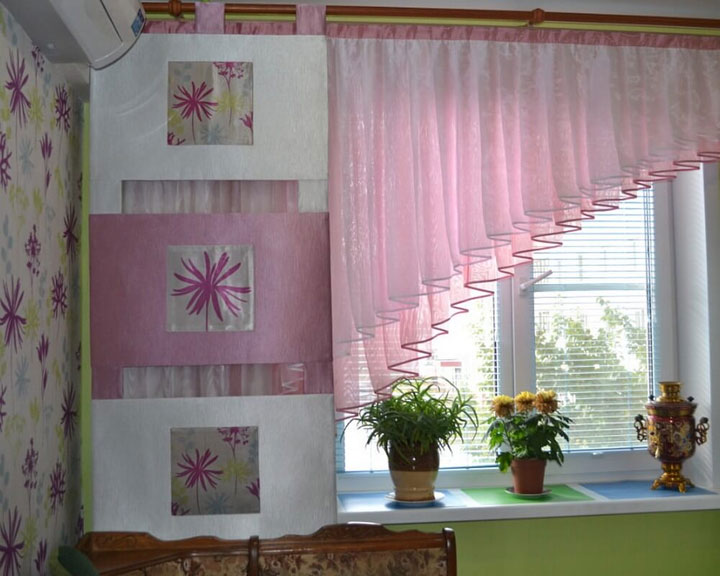 В глубине откоса на необходимой высоте монтируется карниз. Шторы крепятся крупными или небольшими кольцами. Для оформления подходят полотна любых цветов. Прекрасно смотрятся варианты с цветочным или геометрическим орнаментом. Это простое решение, которое не требует больших материальных вложений и времени.