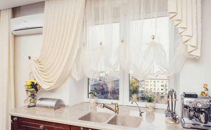 Дизайн оконного проёма для каждой комнаты имеет свои особенности. И кухня не исключение. При обустройстве комнат хранительницы очага выбирают функциональность мебельных конструкций и практичность материалов. Таких же принципов нужно придерживаться при выборе текстиля. Для оформления оконного проёма в традиционном стиле и визуального увеличения пространства можно купить тюль для кухни. Но есть другие, не менее очаровательные решения, которые будут органично смотреться в различных интерьерах. Предлагаем рассмотреть варианты оформления оконного проёма короткими шторами, длина которых доходит до уровня подоконника и не опускается ниже.