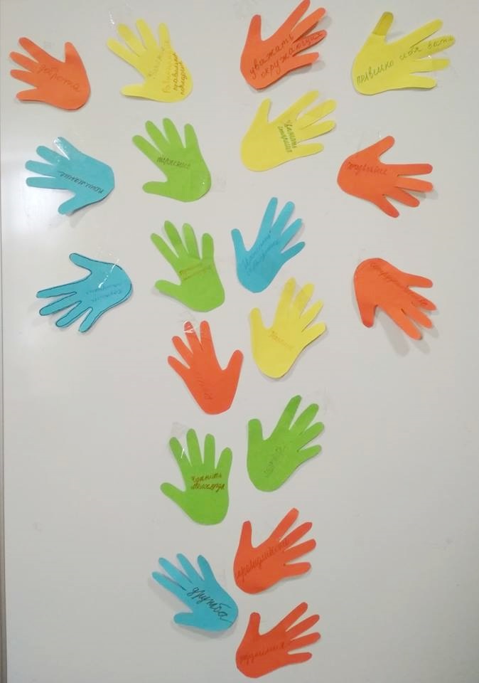 Изюминкой общения стало «Дерево толерантности», которое заполнилось разноцветными детскими бумажными ладошками. На них дети написали такие слова: терпение, уважение, улыбка, доброта, сострадание, дружба и чуткость.