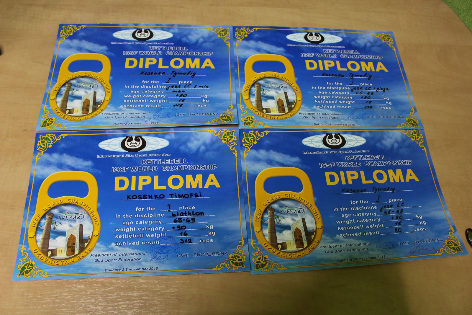 3 ноября гиревики должны были показать свои умения в двоеборье. В первом упражнении Т. Косенко толкнул от груди две гири весом 16 кг каждая за 10 минут 97 раз. А в следующем упражнении мужчина выполнил рывок одной гири таким же весом за 10 минут 215 раз. В сумме спортсмен заработал 312 очков и стал третий раз чемпионом мира.