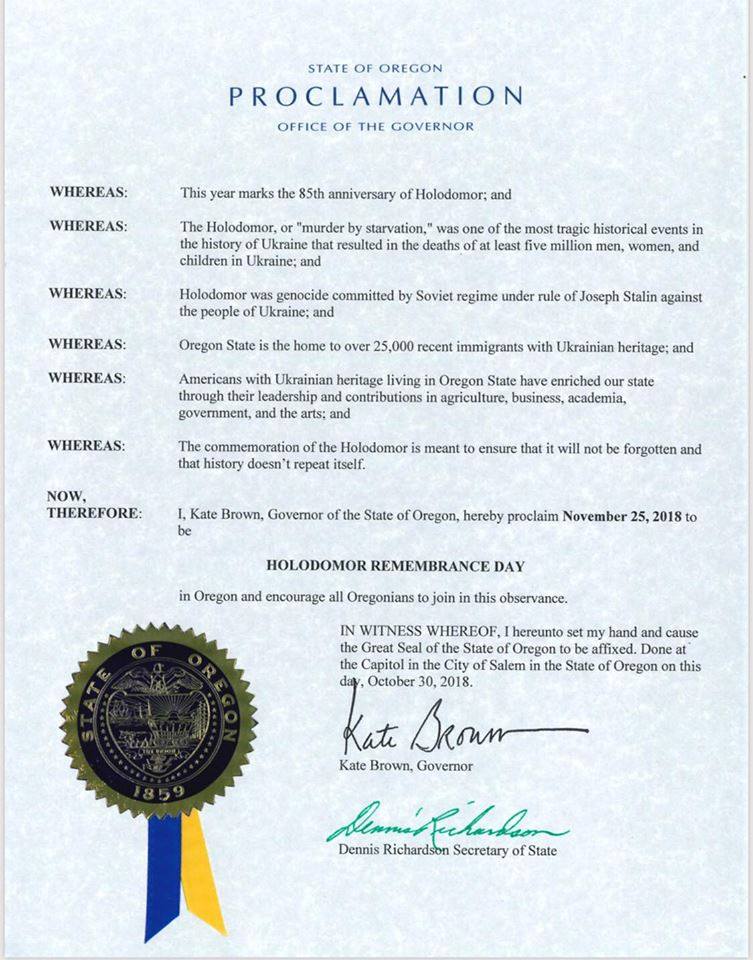 К публикации прикреплена прокламация губернатора штата Кейт Браун, в которой говорится: "Голодомор - это геноцид, совершенный советским режимом под руководством Иосифа Сталина против украинского народа".