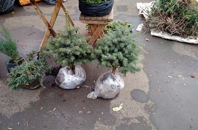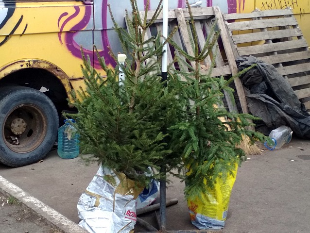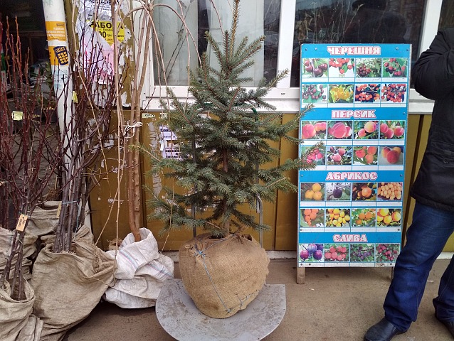 Елки продаются с комом земли, завернутым в пакет. За одну такую елку просят от 350 до 750 гривен.