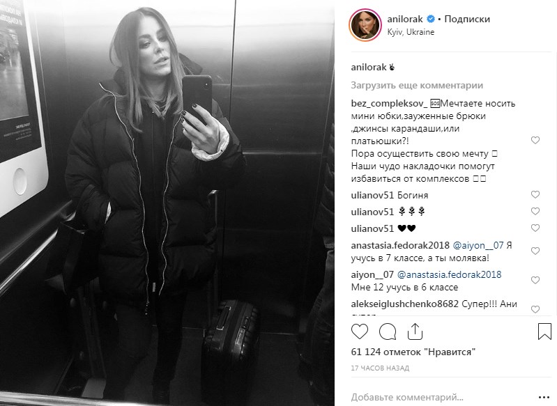 Известная певица Ани Лорак, которая долгое время проживает и работает в России, приехала в Киев. Об этом артистка сообщила на своей странице с Instagram и прикрепила соответствующее фото, сделанное в лифте.