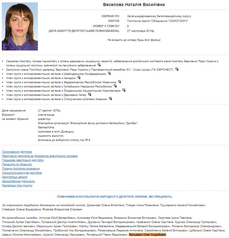 Наталья Веселова - внефракционный народный депутат VIII созыва. Олег Ярошевич является ее действующим помощником. Наталья Веселова проголосовала за принятие проекта закона 8487.