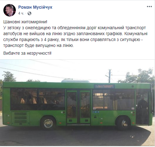 "В связи с гололедом и обледенением дорог коммунальный транспорт не вышел на линию согласно запланированных графиков. Коммунальные службы работают с 04.00, как только они справятся с ситуацией - транспорт будет выпущен на линию", - написал он.
