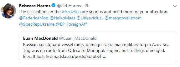 Мировое сообщество обязано уделять больше внимания эскалации конфликта в Азовском море между Россией и Украиной. Об этом написала член Европейского парламента Ребекка Хармс на странице в Twitter.