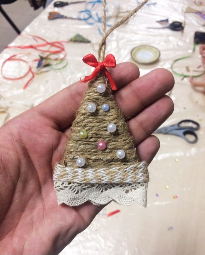 Участники мастер-класса с интересом наблюдали за Адилем и прилагали все усилия, чтобы их поделки получились не хуже, чем у него. Делали участники игрушки в виде елочки. Для этого использовали бечевки, ленты, бусины и др. элементы декора.