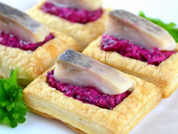 Предлагаем удивить гостей любимой классической селедкой под шубой, но с авангардными вариантами подачи: в первом случае - это будет сельдь «над шубой», а во втором - под свекольным муссом, в форме свечи.
