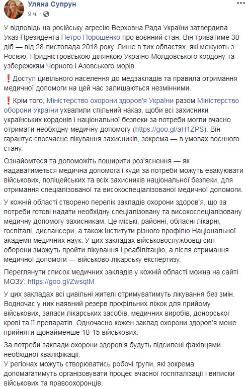 Во время военного положения в Украине доступ гражданского населения к получению медицинской помощи не будет ограничен. Об этом исполняющая обязанности министра здравоохранения Ульяна Супрун написала на своей странице в Facebook.