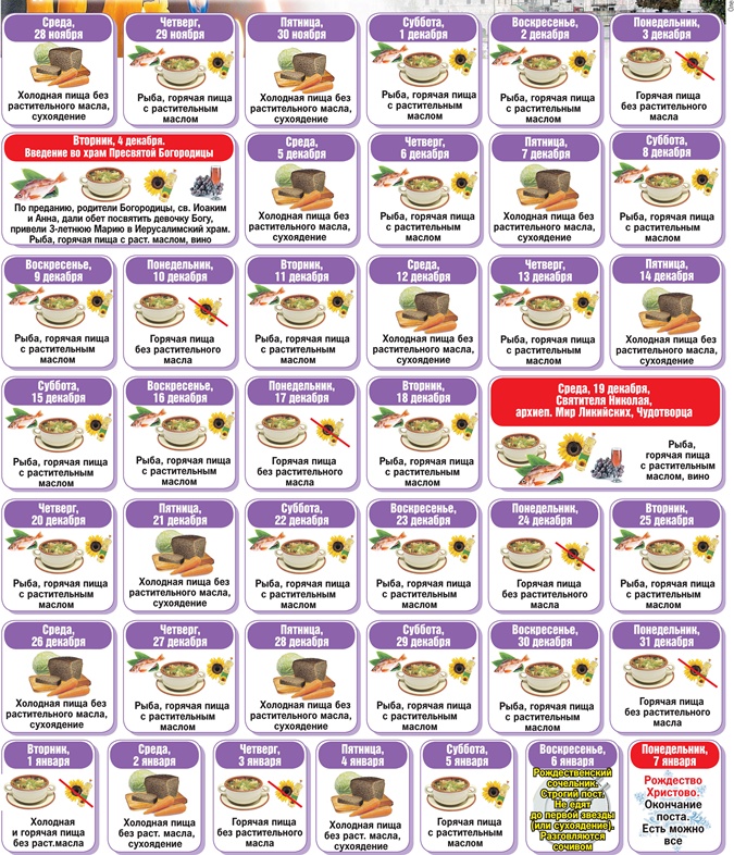 В период поста, 40 дней, запрещено есть скоромную пищу, употреблять сладости и алкоголь. В целом Рождественский пост не является строгим, так как в выходные и дни церковных праздников, если они приходятся на вторник и четверг, разрешено употреблять рыбу и бокал красного вина.
