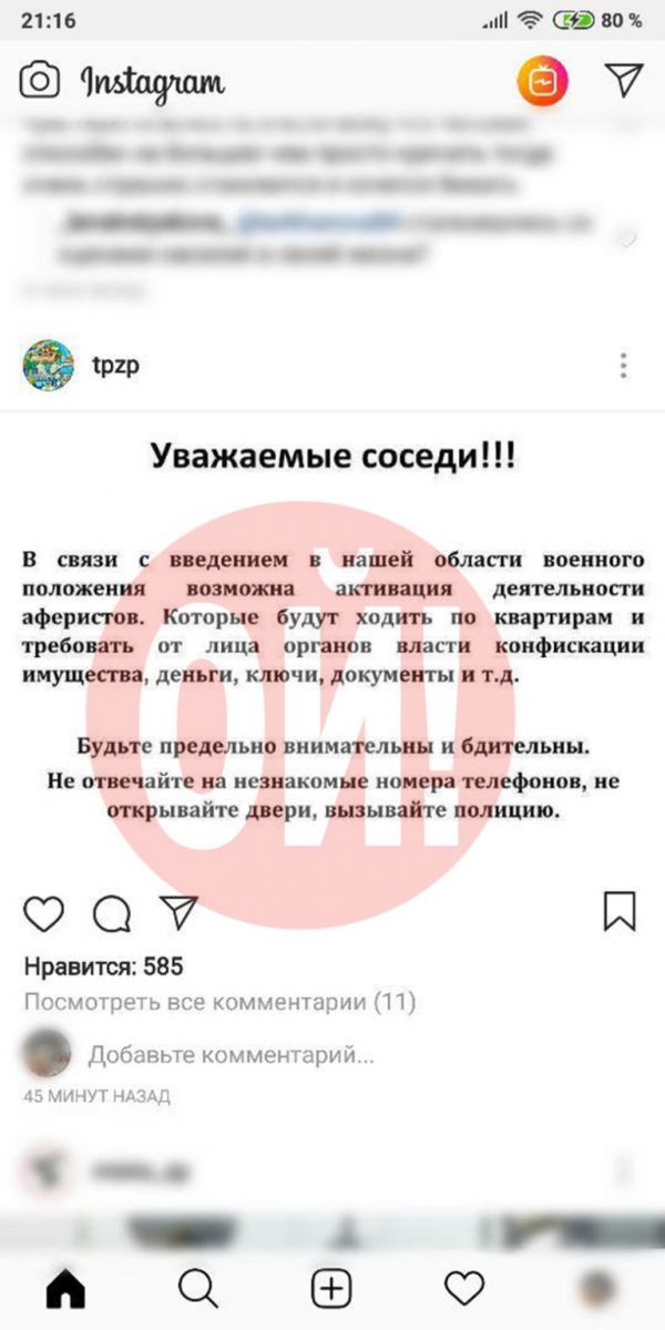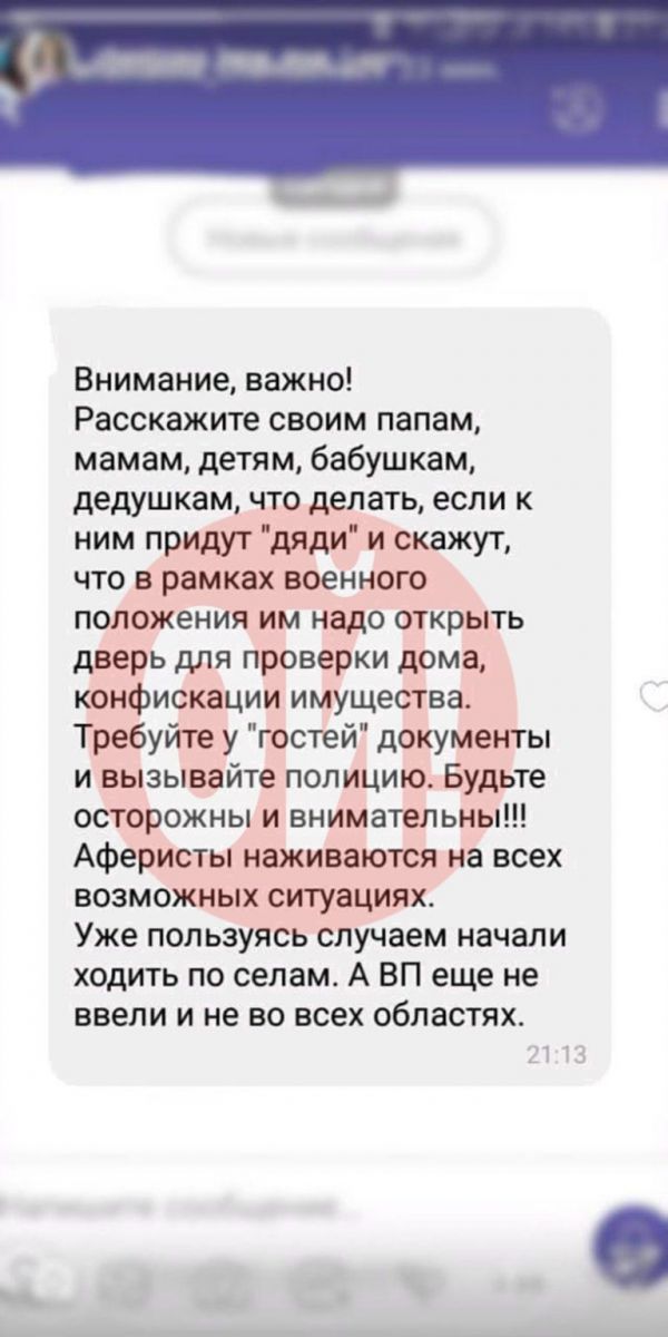 Так, в сети появились предупреждения для горожан о том, что делать если к ним придут люди, требуя открыть дверь для конфискации какого-либо имущества в рамках военного положения. В подобных ситуациях запорожцев просят немедленно вызывать полицию.