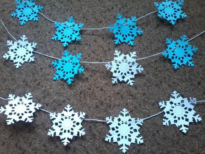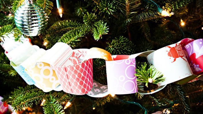 Каждый помнит еще со школьных времен о гирлянде-цепочке, сделанной с помощью полосок цветной бумаги. Вместо бумаги сейчас нередко используют атласные ленточки или тесьму. Гирлянду можно сделать не только из колец. Можно прикрепить снежинки, дождик или вырезанные из бумаги новогодние фигурки на ленту.