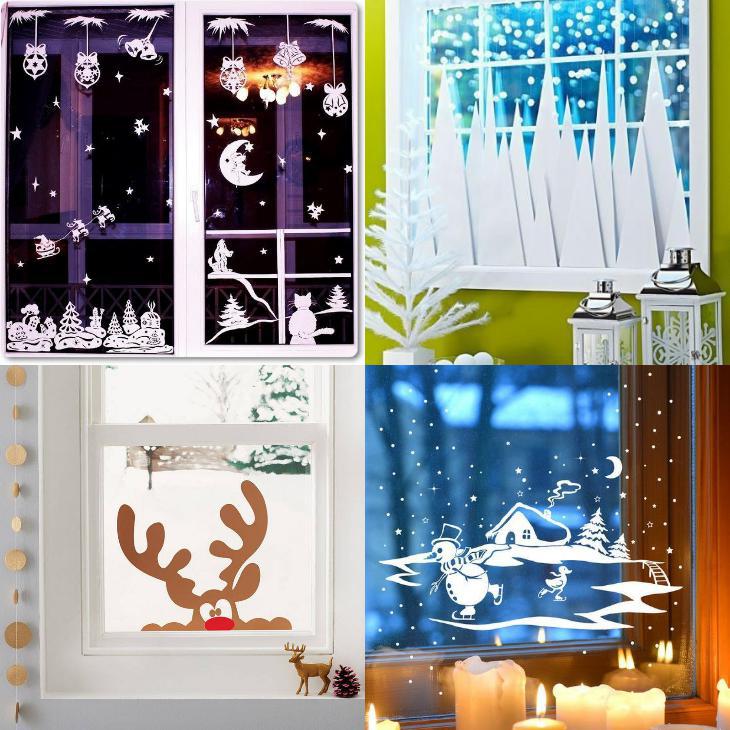 Хорошим способом декорировать дом к 2019 году будет украшение окон при помощи трафаретов. Для их изготовления распечатывается лист бумаги с выбранным рисунком, а затем он вырезается из бумаги. Для украшения окон к Новому 2019 году можно использовать изображения елки, свинок, Деда Мороза со Снегурочкой, снежинок и различных сюжетов.