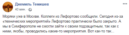 "Моряки уже в Москве. Коллеги из Лефортово сообщили. Сегодня из-за "технических мероприятий" Лефортово практически было закрыто. А мы в Симферополе не смогли зайти к своим подзащитным, так как с ними, якобы, проводились какие-то мероприятия. Вот как-то так…", – написал Темишев.