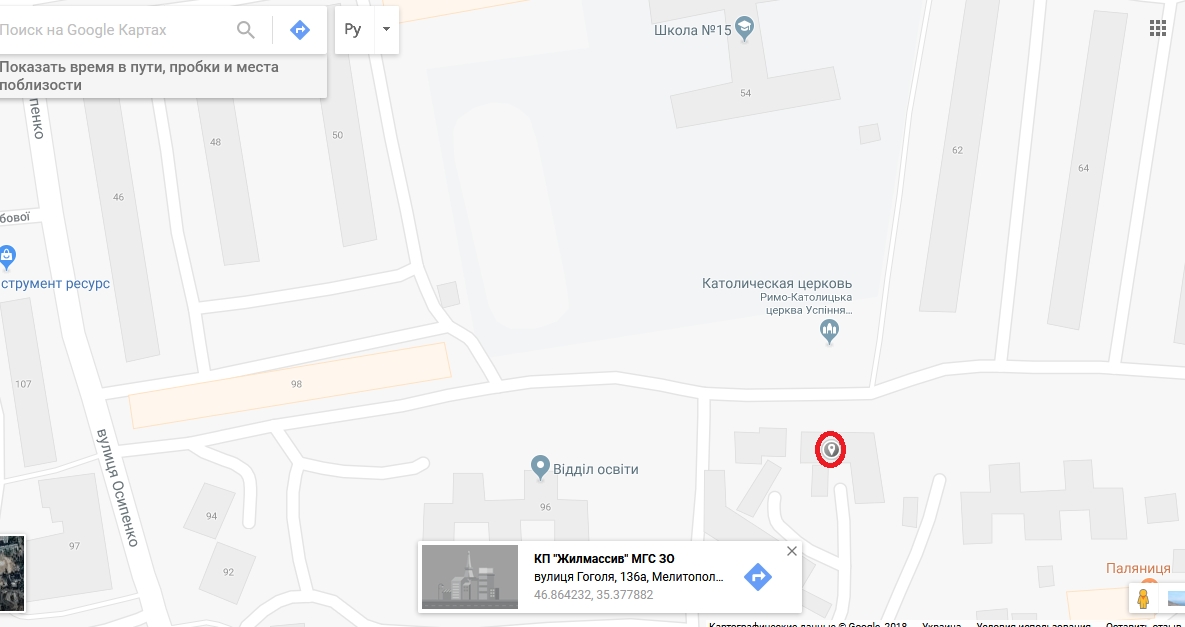 Поэтому напоминаем, что новый офис КП «Жилмассив» находится по адресу: ул. Гоголя, 136а. Центральный вход расположен прямо напротив Римо-католической церкви Успения Пресвятой Девы Марии. Слева от офиса находится детский сад № 41 «Барвинок», немного дальше справа – управление образования. Если идти в КП с ул. Гризодубовой, то предприятие находится за футбольным полем ООШ № 15.