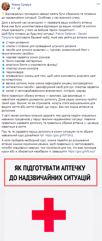 Исполняющая обязанности министра здравоохранения Ульяна Супрун рассказала, что нужно хранить в аптечке на случай чрезвычайных ситуаций в условиях военного положения. Соответствующий пост опубликован в ее Facebook.