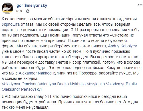 Смелянский утверждает, что многие отделения "Укрпочты" отключают от газа. При этом он утверждает, что данные действия являются не правильными.