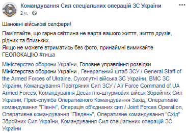 Украинским военным, которые любят делать селфи, порекомендовали отключать при этом геолокацию. Такой совет содержится в сообщении на странице Командования Сил специальных операций в Facebook.