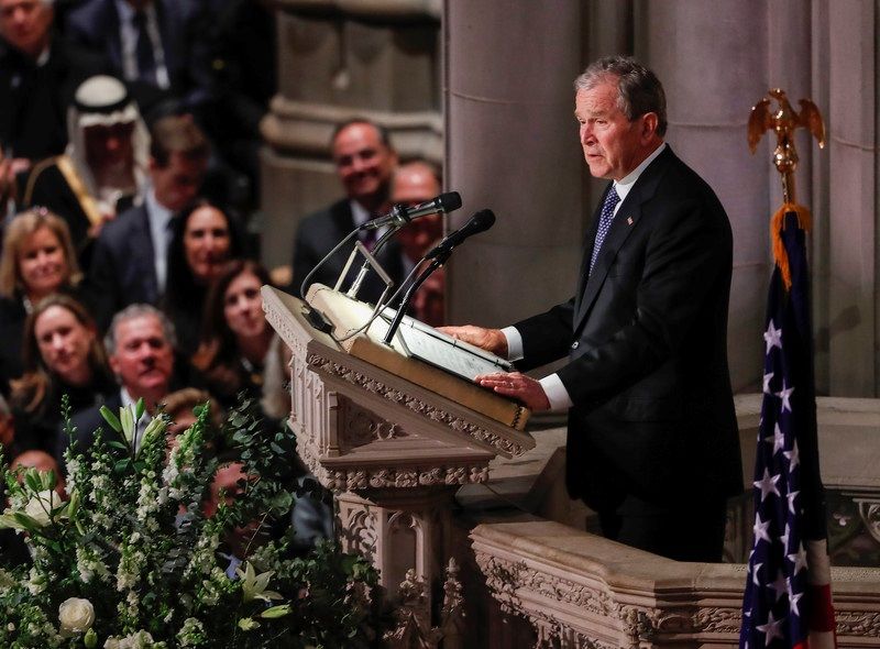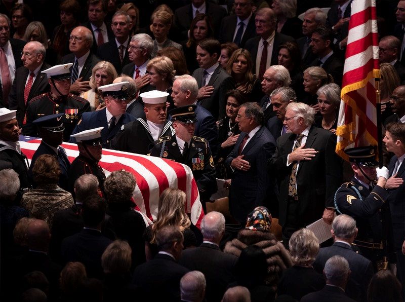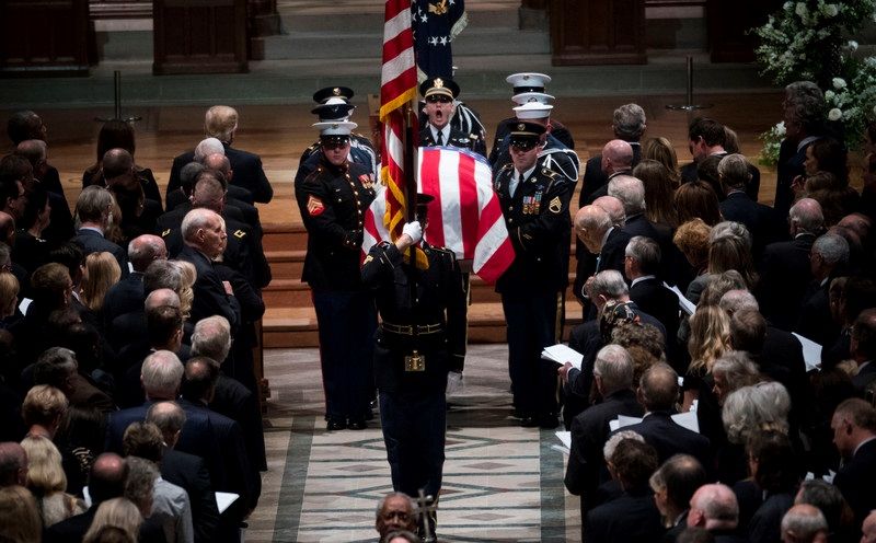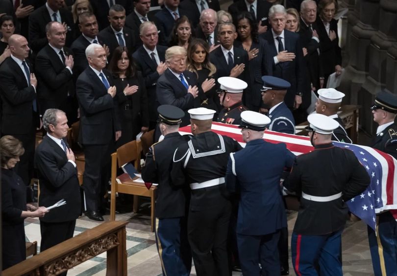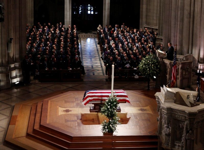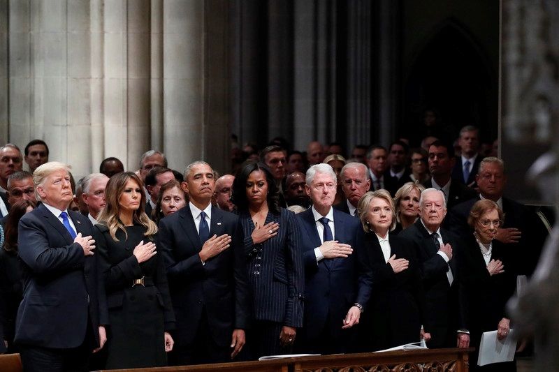 На траурной церемонии присутствовали нынешний глава государства Дональд Трамп с супругой, а также четверо бывших президентов Соединенных Штатов с женами: Джимми Картер, Билл Клинтон, Барак Обама, Джордж Буш-младший.