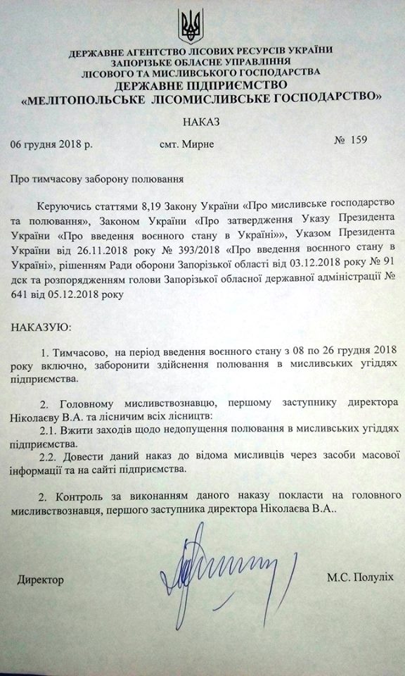 Уже появился текст соответствующего приказа Госагенства лесных ресурсов Мелитопольскому лесоохотничьему хозяйству.