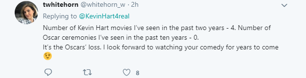 "За последние два года я посмотрела 4 фильма с Кевином Хартом. Количество церемоний „Оскар“, которые я посмотрела за 10 лет — 0. Это потеря для „Оскара“," — присоединилась другая поклонница комика.