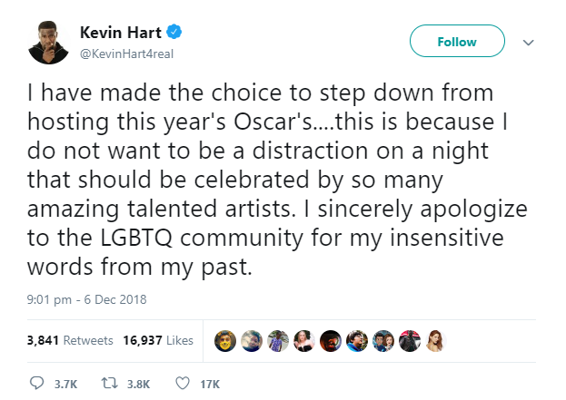 Американский комик Кевин Харт отказался от роли ведущего очередной церемонии вручения премии «Оскар» из-за гомофобных шуток, отпущенных им почти 10 лет назад. О своем решении юморист сообщил поклонникам в Twitter.