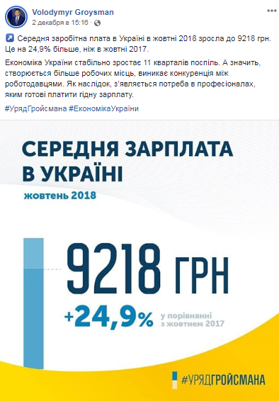 Напомним, премьер-министр Украины Владимир Гройсман 2 декабря в своем Facebook написал, что в октябре 2018 года средняя зарплата в Украине возросла до 9218 грн.