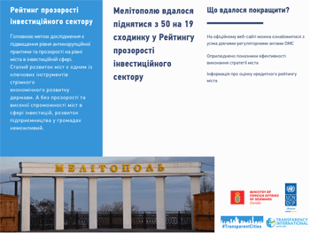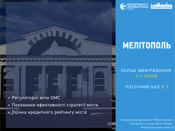 Мелитополь начал внедрять рекомендации Transparency International Украина в отношении ситуации с прозрачностью инвестиционного сектора и сейчас имеет 8,7 баллов из 20, получив 3 балла за следующие нововведения: