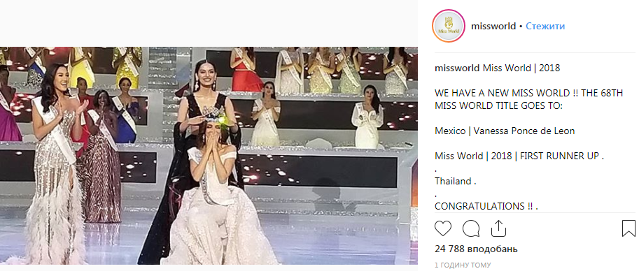 Мексиканская модель и волонтер Ванесса Понсе де Леон завоевала титул "Мисс мира-2018". Об этом сообщается в Twitter проекта.
