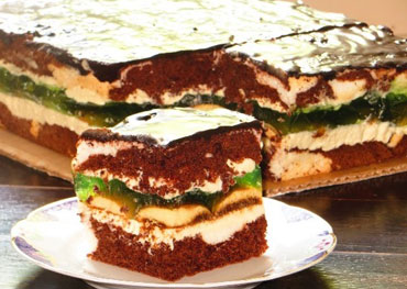 Благодаря прослойке из желе торт в разрезе напоминает зеленые глаза. Кислинка желе, сладкий заварной крем и нежный бисквит создают неповторимый праздничный вкус!