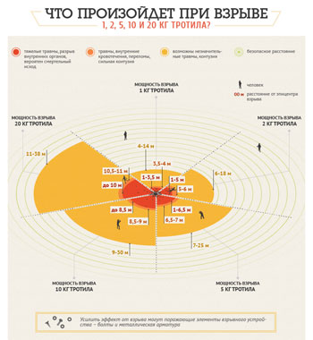 А мы отметим, что 10 кг тротила хватит, чтобы обеспечить серьезный взрыв, поражающий все живое на расстоянии 8,5 метров от эпицентра.