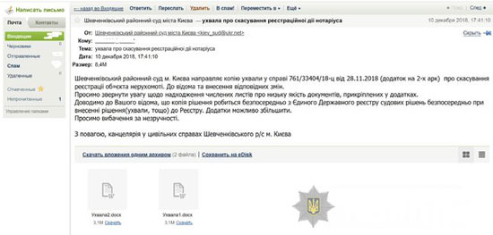 "Специалисты 11 декабря начали фиксировать факты распространения этого вредоносного программного обеспечения. В общем, оно было нацелено на пользователей, которые являются частными нотариусами Украины. Для передачи вредоносного программного обеспечения правонарушители использовали почтовые сервисы украинских компаний www.ukr.net и www.i.ua. Сообщение с вредными приложениями поступали как бы от имени государственных учреждений, в том числе судов различных инстанций", - говорится в сообщении.