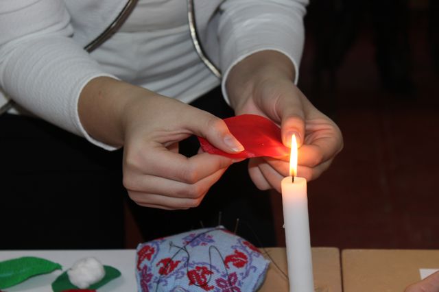 Затем участники приступили к формированию цветка, предварительно обпалив концы ткани, дабы она в дальнейшем не распускалась. После лепестки складываются в цветок. Собрать их вместе можно с помощью клея. Сделать середину очень легко, зашив ватку в ткань.