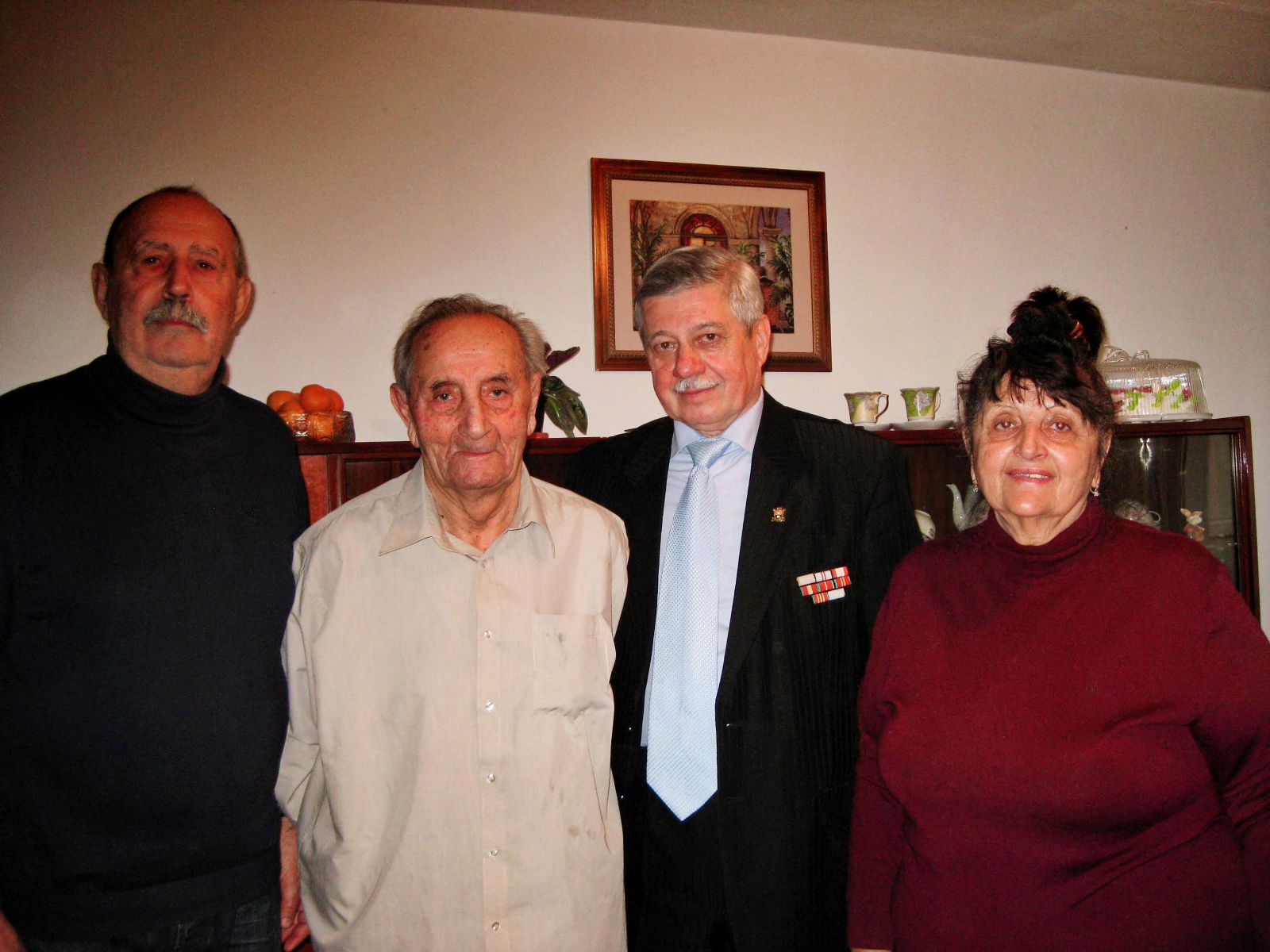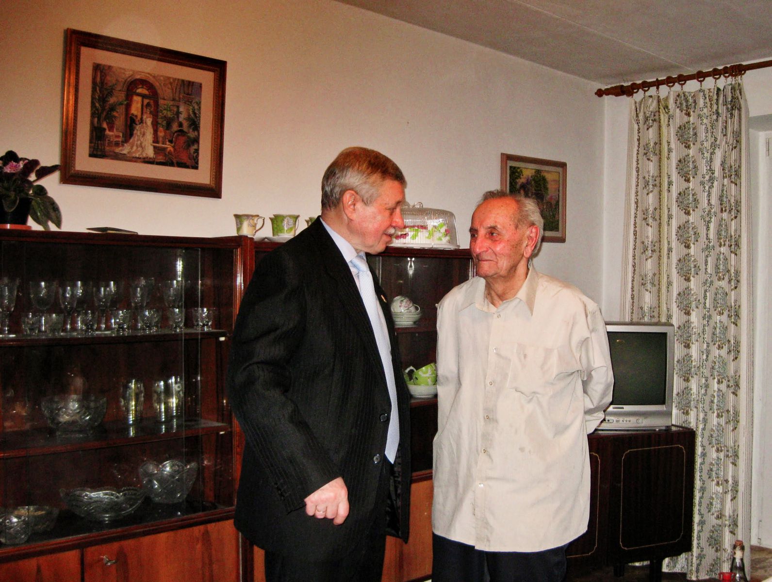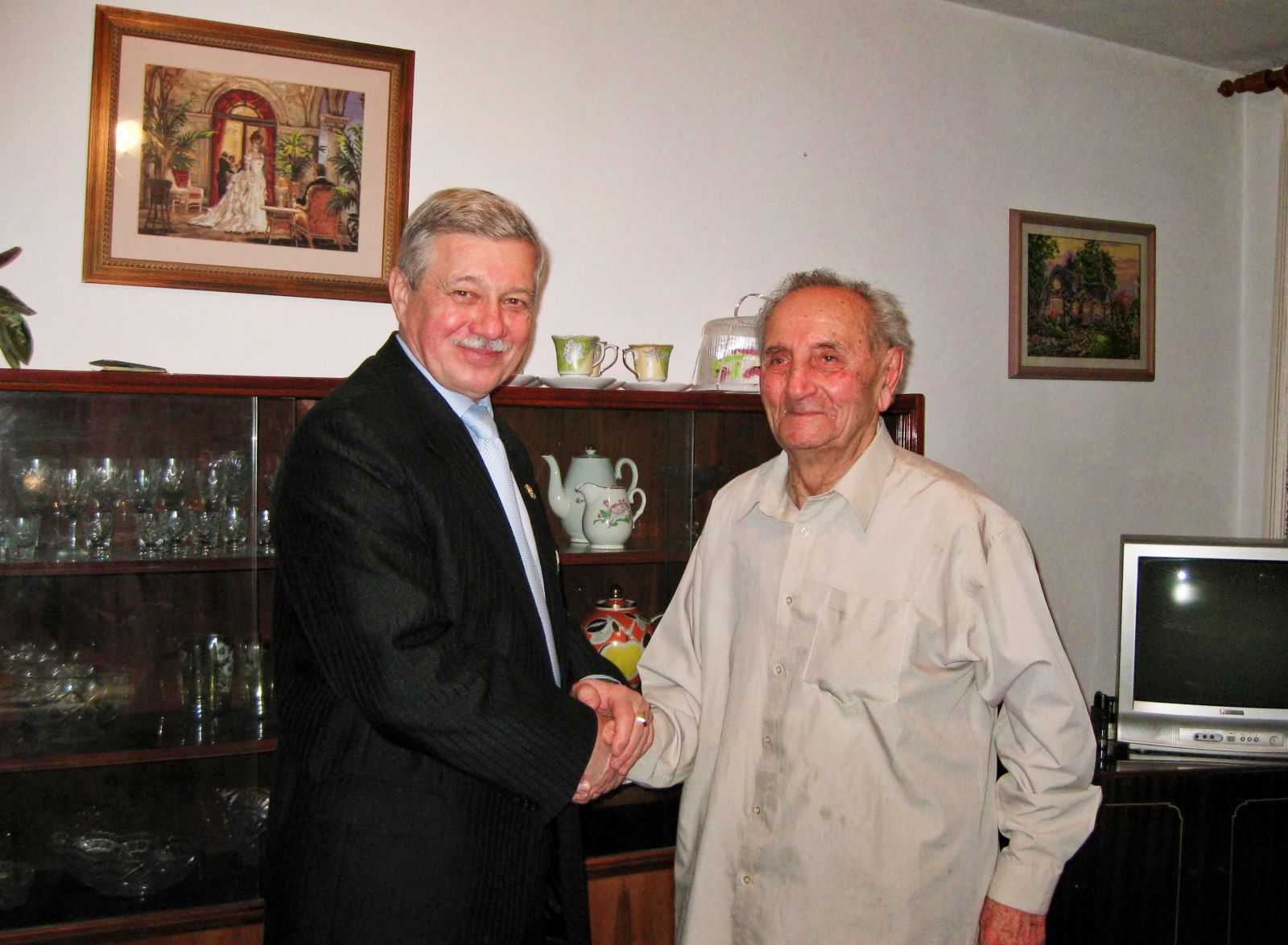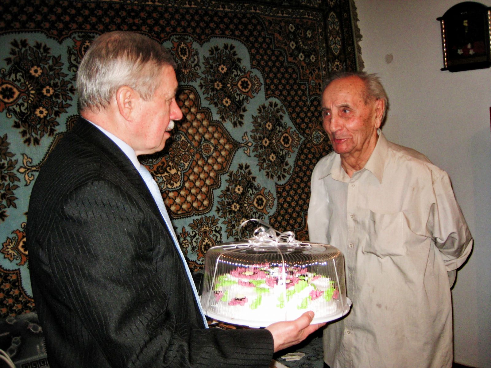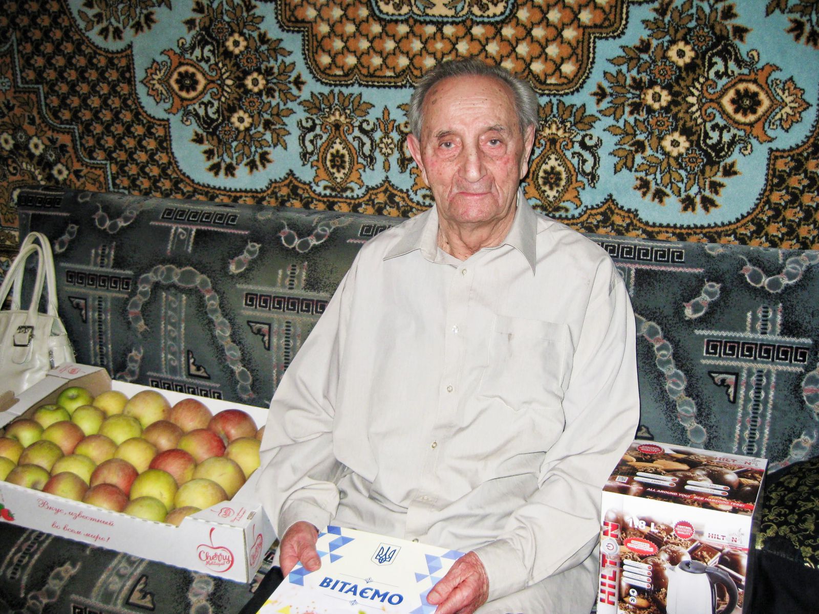 В славный юбилей его поздравил председатель мелитопольской городской организации ветеранов Евгений Бабенко. Он вручил ветерану от имени городской власти грамоту и большой лоток яблок из наших мелитопольских садов, а от совета ветеранов - ценный подарок и юбилейный торт, пожелал крепкого здоровья, счастья, бодрости.