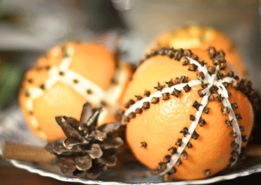 При помощи гвоздичных бутонов на корке апельсинов и мандаринов с достаточно плотной кожицей выкладывают любой рисунок - узор либо смешную рожицу - или пишут поздравление, пожелание. Таким образом, можно сделать как украшение для стола, так и елочную игрушку.