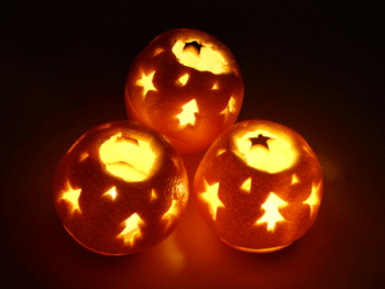 Лучше взять фрукт с плотной кожурой. Плод разрезают на 2 части поперек, вынимают мякоть. В одну часть помещают свечку, другой, на которой вырезаны звезды, полумесяцы или другие фигурки, накрывают нижнюю половинку фрукта со свечкой.